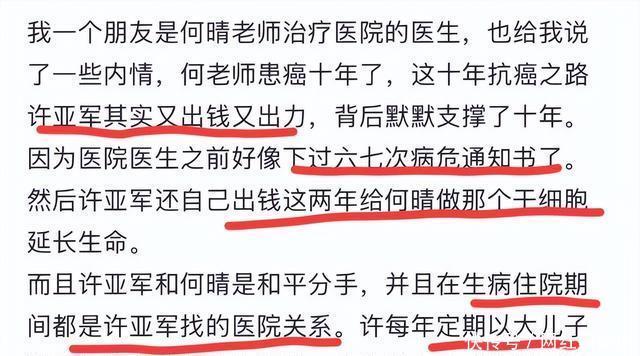 这下子舆论瞬间就不淡定了,前妻刚刚过世,大儿子许何刚刚失去母亲,作为父亲和前夫的许亚军不仅没有出现在北京的告别仪式上,反而在大洋彼岸享受。 不少网友直指他太过于冷血,只顾着陪小儿子,完全不顾及大儿子的感受和旧情,但就在骂声一片的时候,事情突然迎来了大反转。 有自称是何晴生前治疗医院的医生和知情人士出来爆料,说大家看到的只是表面现象,根据内部消息,许亚军根本不是外界想象的那种冷漠前夫。